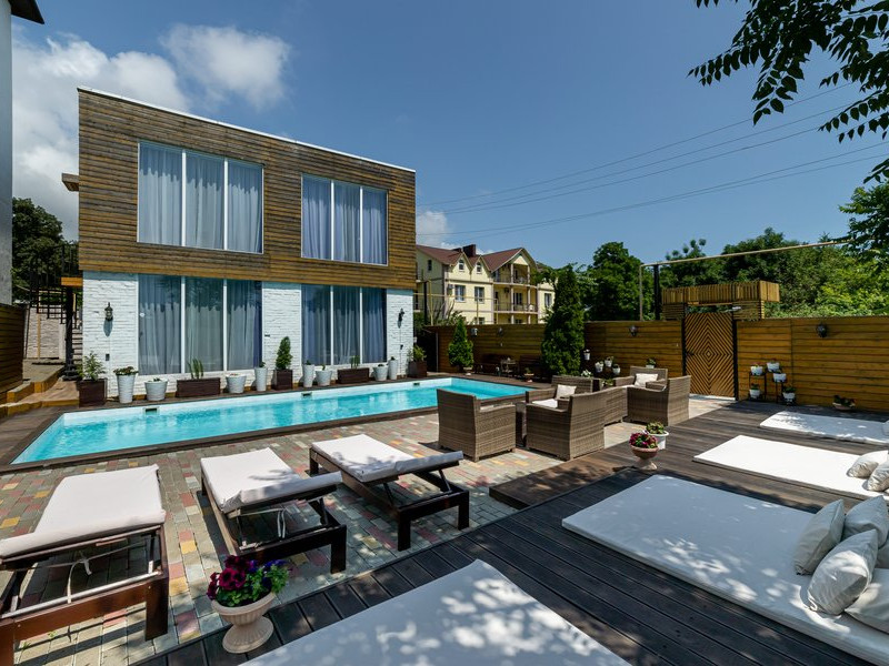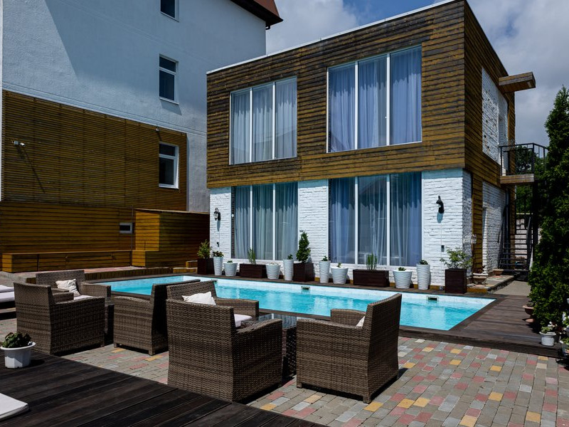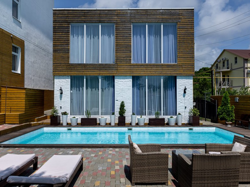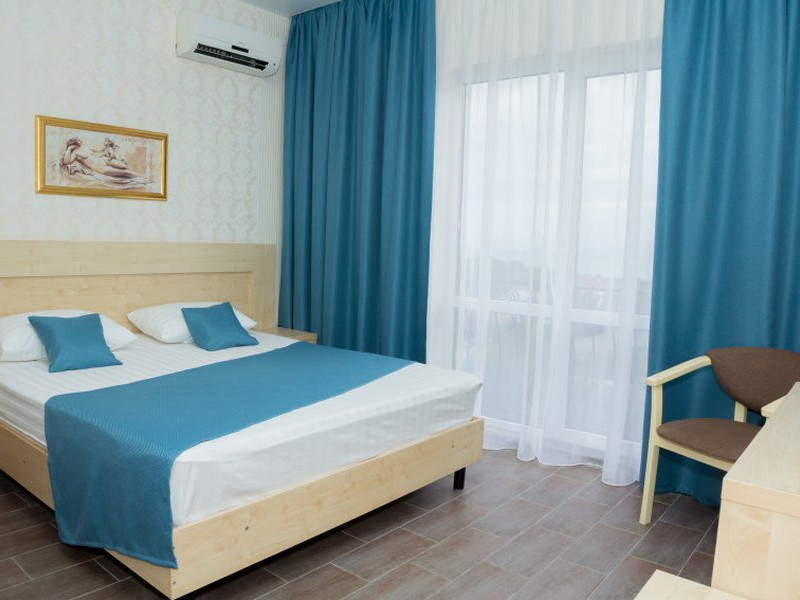 Это современный отель, который находится в тихом районе Геленджика в Голубой бухте.